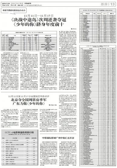 - 北京夺全国周票房季军 广东力挺《少年的你》