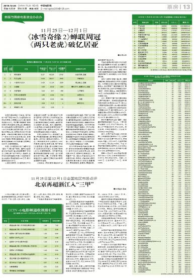 11月25日至12月1日(第48周),全国电影票房排名上半区的十五省市依次为:广东、江苏、北京、浙江...
