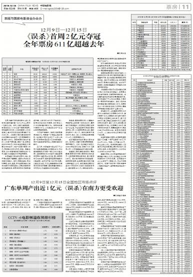 2019年12月9日至12月15日(第50周),全国电影票房排名上半区的十五省市依次为:广东、江苏、...