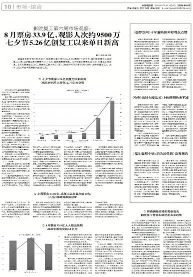 - 8月票房33.9亿,观影人次约9500万 七夕节5.26亿创复工以来单日新高