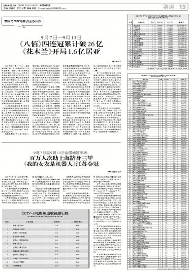 2020年第37周(9.7-9.13),全国影院复工第八周,大盘报收6.5亿元左右票房。电影《八佰》...