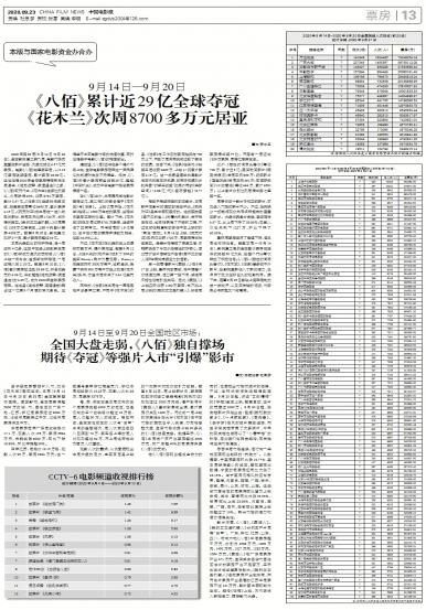 由于缺乏新晋强片入市,加之《花木兰》表现疲软,本周(9月14日-9月20日 第38周)全国票房整体回...