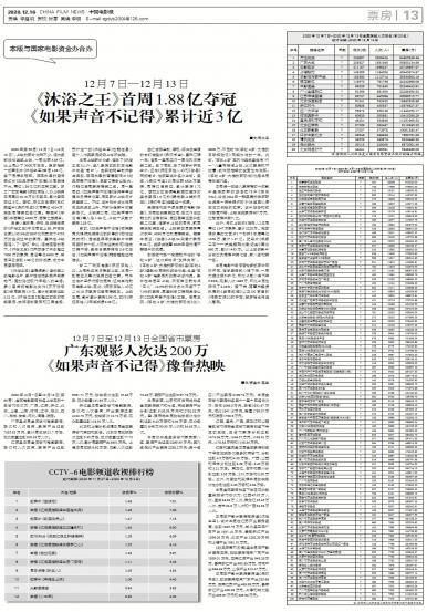 2020年12月7日至12月13日(第50周),全国电影票房排名上半区的十五省市依次为:广东、江苏、...
