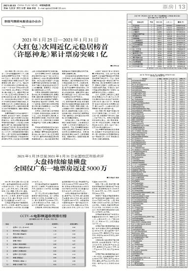 - 《大红包》次周近亿元稳居榜首 《许愿神龙》累计票房突破1亿