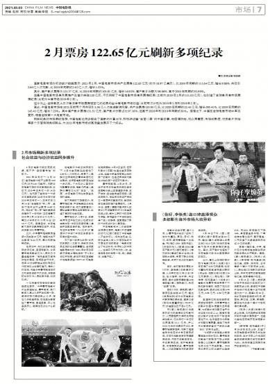 国家电影专资办初步统计数据显示:2021年2月,中国电影市场共产出票房122.65亿元(约为18.9...