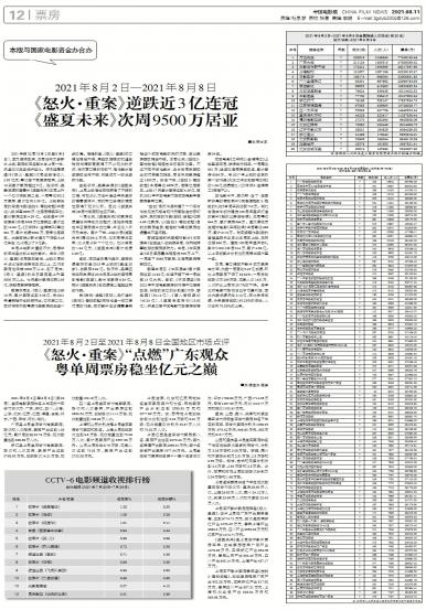 2021年8月2日至8月8日(第32周),全国电影票房排名上半区的十五省市依次为:广东、浙江、四川、...