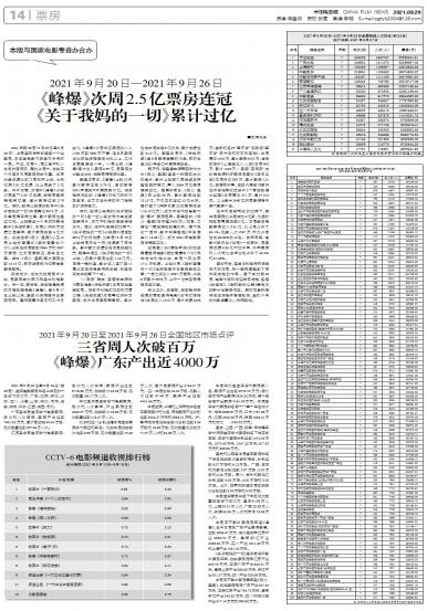 2021年9月20日至9月26日(第39周),全国电影票房排名上半区的十五省市依次为:广东、江苏、浙...