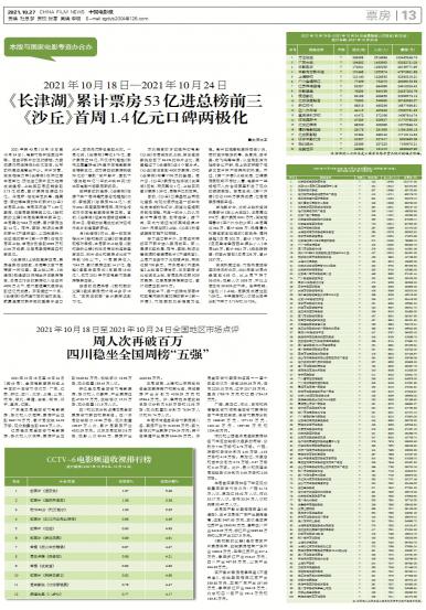 2021年10月18日至10月24日(第43周),全国电影票房排名上半区的十五省市依次为:广东、江苏...