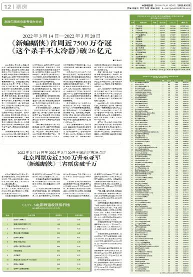 - 北京周票房近2300万升至亚军 《新蝙蝠侠》三省票房破千万