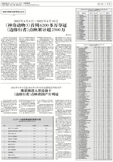 2022年第14周(4月4日至4月10日),新片上映以及清明节后两天假期加持,一周大盘报收1.92亿,比前一周回升五成以上,同时场次和人次也都迎来一定程度的增长。单片方面,“神奇动物”系列最新篇章《神奇动物:邓布利多之谜》新片开画,首周三天收获6210万成绩,拿下周榜冠军。索尼影业动画作品《精灵旅社4:变身大冒险》上映次周,在四天假期帮助下收获2824万成绩,位列第14周亚军,累计成绩接近4000万。科幻灾难片《月球陨落》本周再收2341万票房,成为本周季军,累计成绩1.24亿。悬疑片《密室逃生2》本周再收2134万,周榜位居第四,累计票房3322万。任贤齐、任达华等主演的动作犯罪悬疑电影《边缘行者》继续点映,1533万票房位居周榜第五,未正式上映累计成绩已达2510万。
