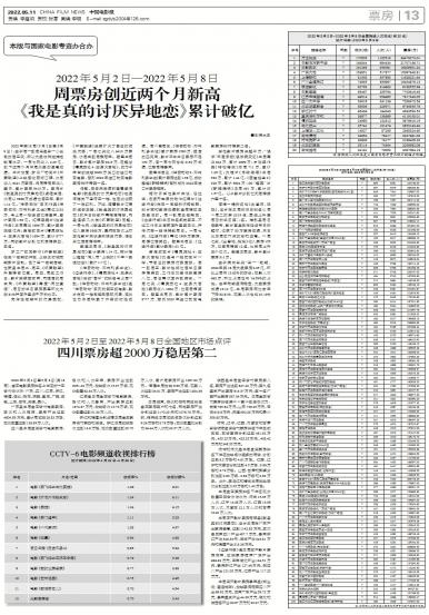2022年5月2日至5月8日(第18周),全国电影票房排名上半区的十五省市依次为:广东、四川、江苏、...