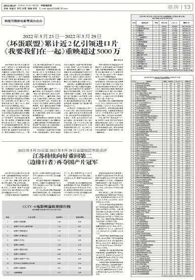 2022年第21周(5月23日至5月29日),经历过“5·20”档后本周大盘数据稍稍回落,一周票房1...
