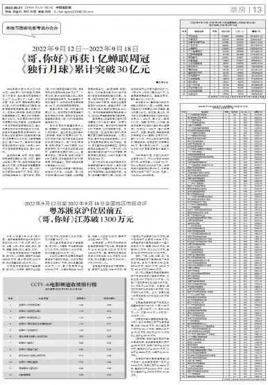 9月12日至9月18日(第37周),全国电影票房排名上半区的十五省市依次为:广东、江苏、浙江、北京、...