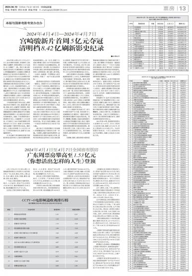 2024年第14周(4月1日至4月7日),包含清明节假期,多部新片上映带动大盘蹿升,周票房攀至11....