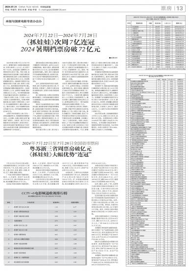 - 《抓娃娃》次周7亿连冠 2024暑期档票房破72亿元