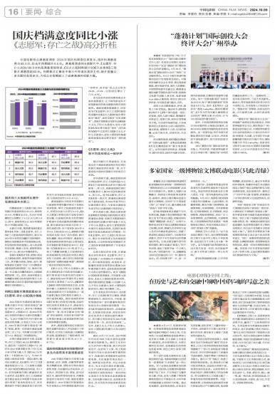 中国电影观众满意度调查·2024年国庆档调查结果显示,国庆档满意度得分83.3分,较去年同期提升0....
