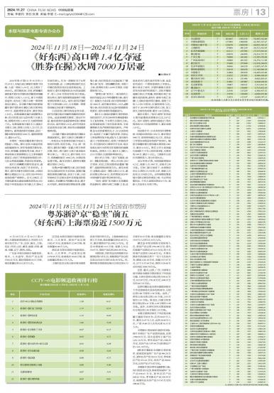11月18日至11月24日(第47周),全国电影票房排名上半区的十五省市依次为:广东、江苏、浙江、上...
