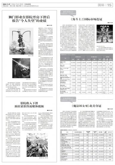 上周末,派拉蒙的《角斗士2》在64个国际市场中新增票房5050万美元,其国际累计票房已达1.655亿...