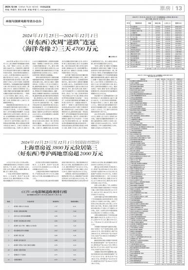 11月25日至12月1日(第48周),全国电影票房排名上半区的十五省市依次为:广东、江苏、上海、浙江...