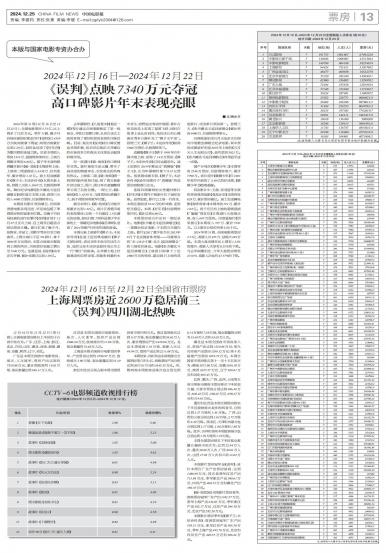 12月16日至12月22日(第51周),全国电影票房排名上半区的十五省市依次为:广东、江苏、上海、浙...