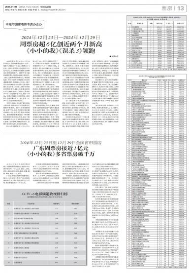 2024年第52周(12月23日至12月29日),全国电影票房收入6.2亿,观影人次超1535万,比...