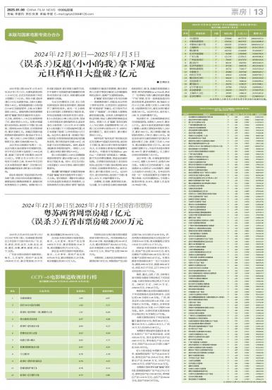 2025年第1周(2024年12月30日至2025年1月5日),全国电影票房收入11.62亿元,在元...