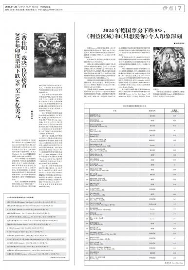 2024年,印度票房创下历史第二高纪录,收入达13.6亿美元(合1183亿印度卢比),较2023年创...