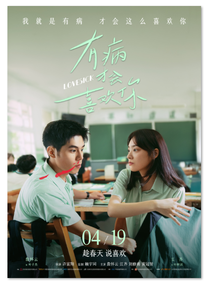 本报讯 由许富翔执导,赖宇同监制,詹怀云、江齐、刘修甫、黄冠智主演的中国台湾引进片《有病才会喜欢你》,近日宣布定档4月19日,并发布“挨揍也喜欢”版定档预告及海报。