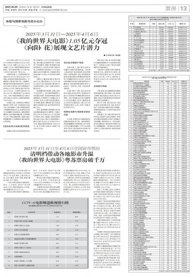 2025年第14周(3月31日至4月6日)全国共产出票房4.62亿元,环比增长118.7%,观影人次...