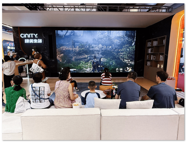 展会现场的CINITY LED上已经配备的电影、直播、游戏、音乐、投屏五项模拟功能,各项功能的演示和体验环节吸引到众多观众与行业同仁驻足。电影方面,CINITY LED专属制版影片的视觉表现让人“一步入位”,“臻美生活”空间内的影院黄金座更近在咫尺。直播方面,高规格直播信号演示,配合5.1环绕声场,让音乐会、演唱会、体育赛事直播等,距离现场更“触手可及”。更吸引人的是游戏表现方面,现场多位“玩家”竞相排队在CINITY LED 上试玩4K 60帧标准的赛车竞速游戏《极限竞速:地平线5》、动作格斗游戏《黑神话:悟空》和《街霸6》。当赛车飞驰而过时扬起的尘土颗粒分明、一招一式的光影特效带来令人炫目的视听享受,“玩家”们完全沉浸于CINITY LED打造的未来生活空间,在超高帧率带来的流畅画面前大呼“太爽了”,现场围观嘉宾的赞叹也不绝于耳:“这绝对是打游戏的标配啊!”